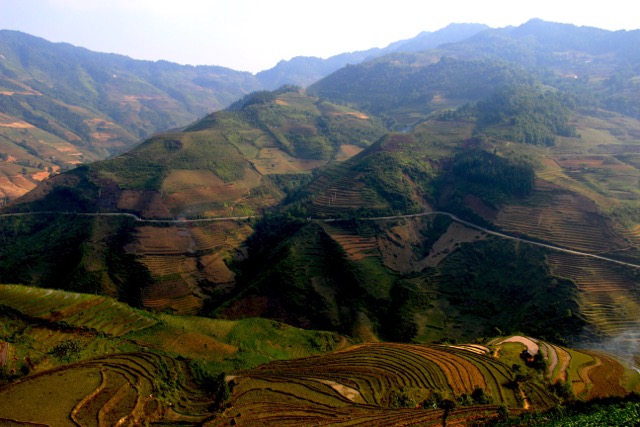 Plein Nord à travers les villages, les collines de théiers, les champs de maïs sur une route sinueuse, nous grimperons un col et redescendrons jusqu’à la rivière Da formant à cet endroit un lac où nous passerons sur le bac. Nous continuerons à longer le lac jusqu’à Phu Yen, nous monterons les montagnes, quelques cols donnant sur les vallées et rentrerons sur le territoire de la province Yen bai à travers les villages, les rizières, les collines de théiers, les jardins des orangers. Nous rejoindrons le village Thai où nous passerons la nuit dans leur maison sur pilotis.